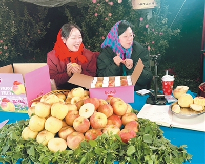 | 辽宁省大连市金州区干部(右)带领团队直播销售三十里堡苹果。 王小妮摄 |