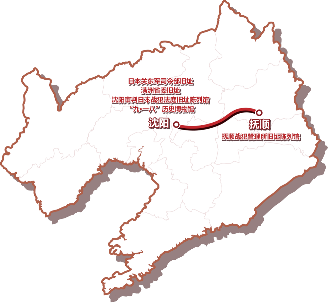 线路节点:日本关东军司令部旧址—中共满洲省委旧址—抚顺战犯管理所旧址陈列馆—审判日本战犯法庭旧址陈列馆—沈阳“九•一八”历史博物馆