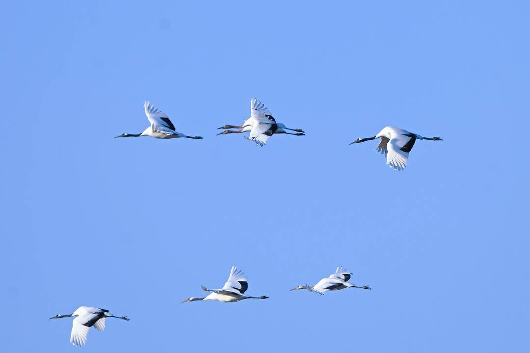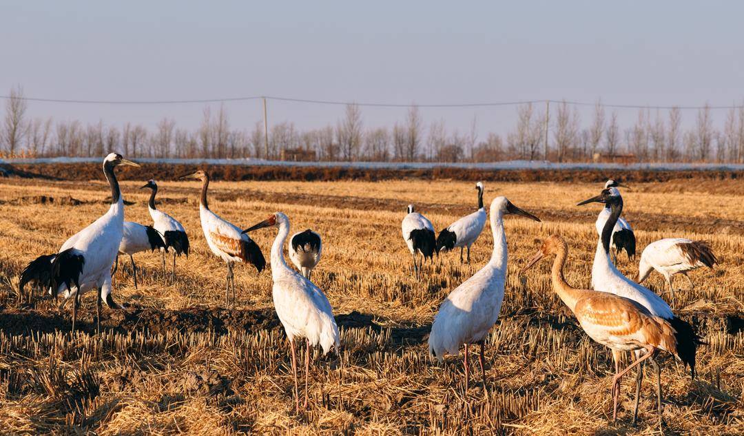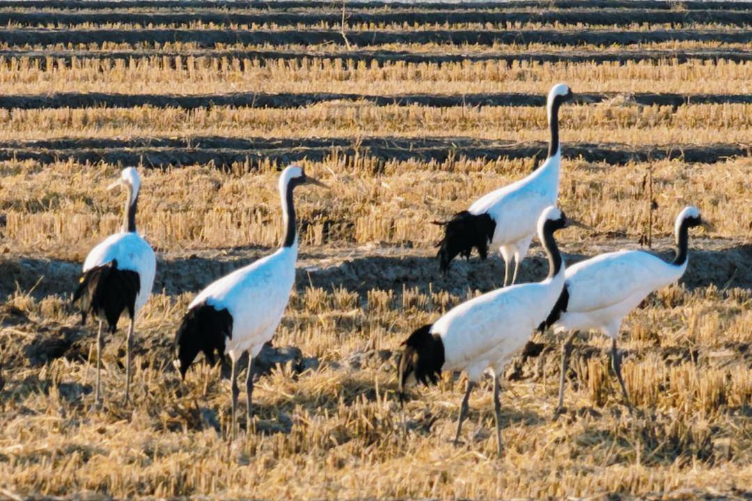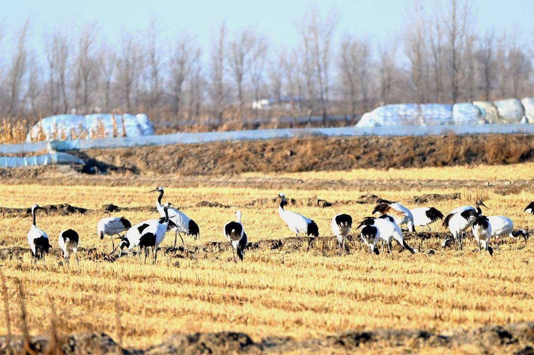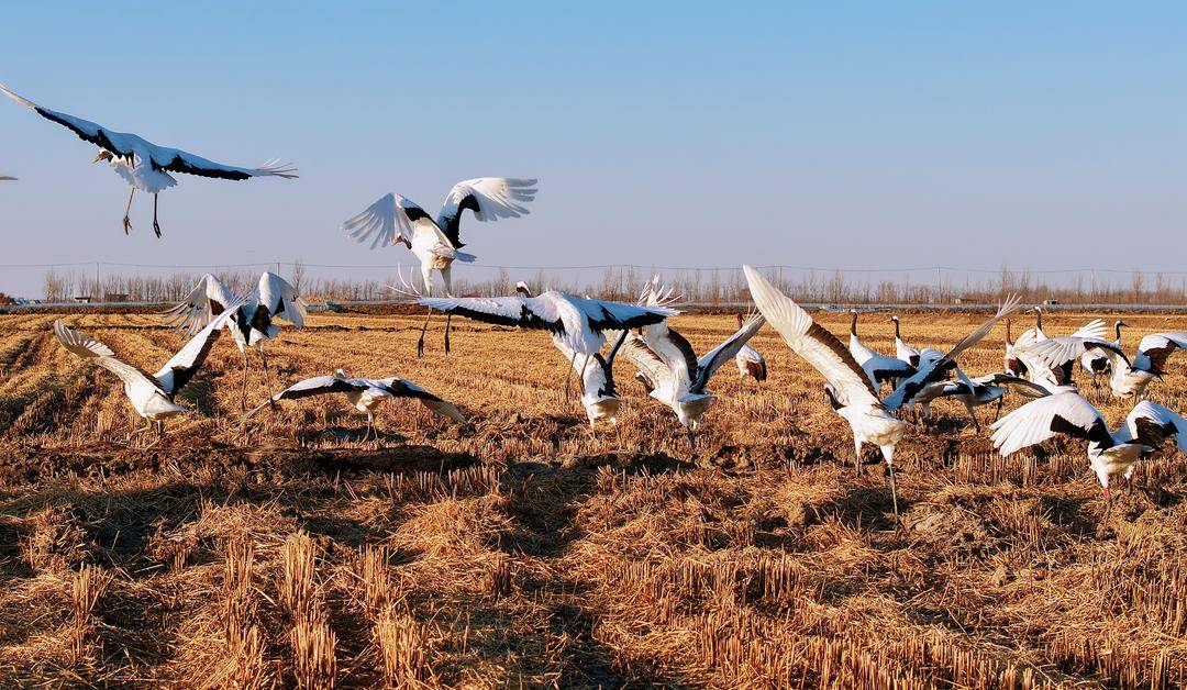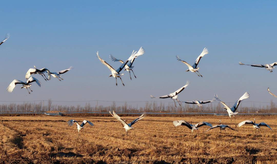 12月3日我省气温偏低,盘锦市辽河三角洲地区收割后的稻田地里更是寒风刺骨,远远的总共近百只的两大群野生丹顶鹤在悠然自得地觅食、休憩,不时发出高亢婉转的鹤鸣、在空中优雅地展翅翱翔。
