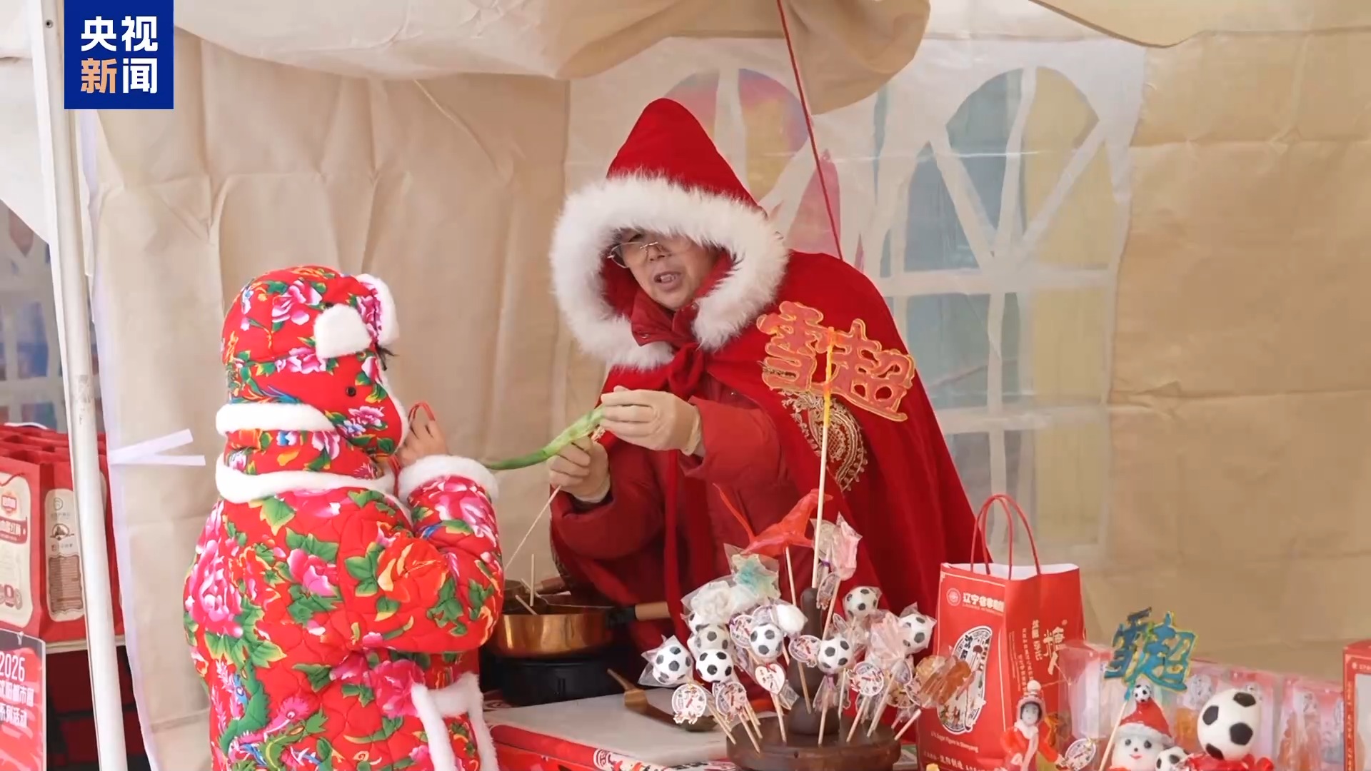 比赛激战正酣,旁边的市集同样热闹。孩子们学习吹糖人、大人们则趁热吃着刚出炉的烙饼,热气腾腾的氛围让市集里聚满了人气。