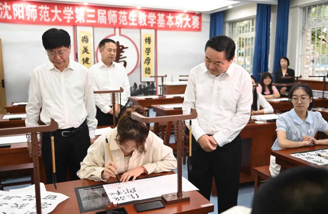 省委书记、省人大常委会主任郝鹏在沈阳师范大学职业技能实训中心智能化书法实训室,观摩学生现场演示,了解学校教学技能实训开展情况。