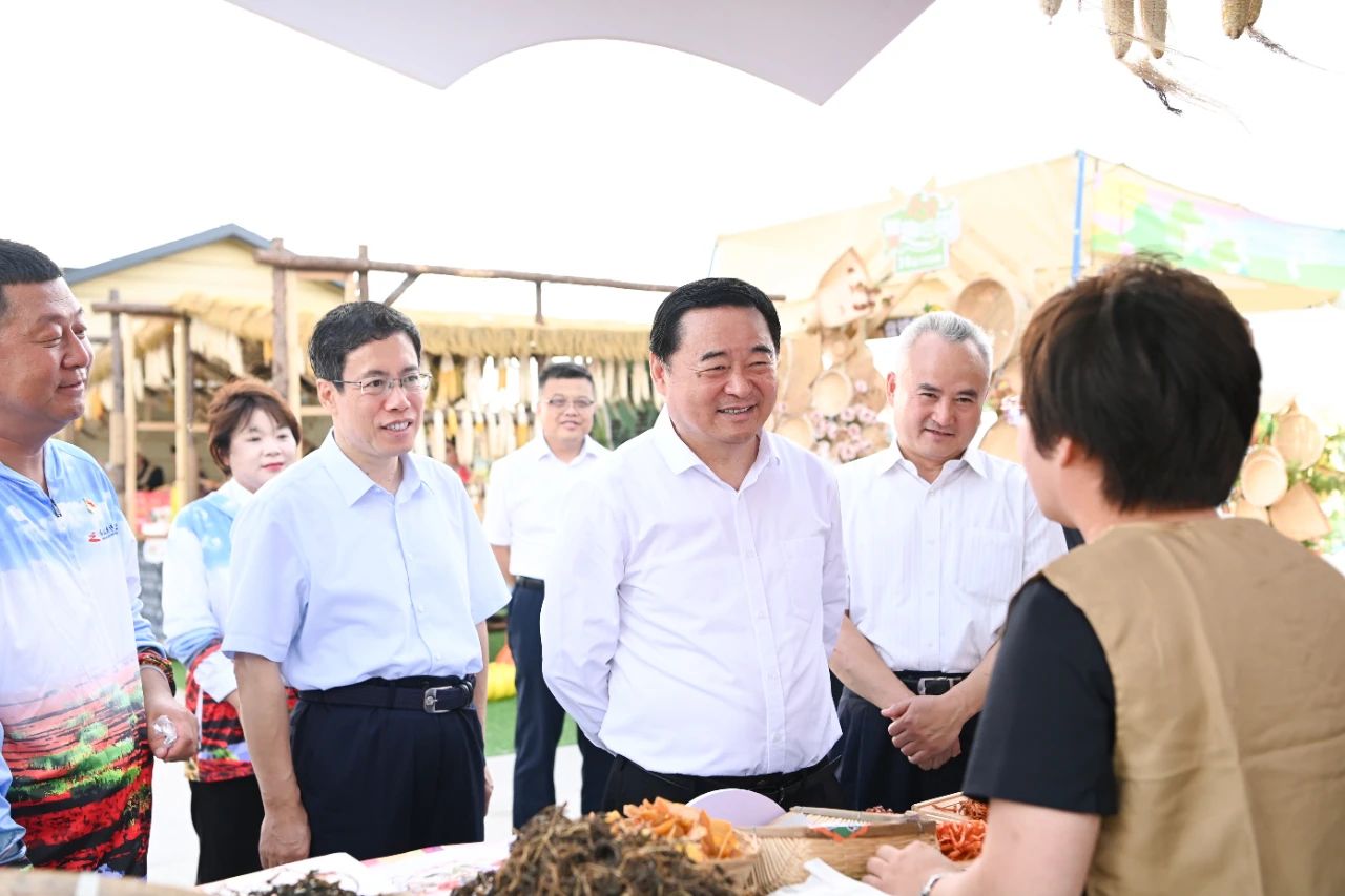 省委书记、省人大常委会主任郝鹏在盘山县“稻里”景区,与陈家镇朝鲜族村党支部书记互动交流。