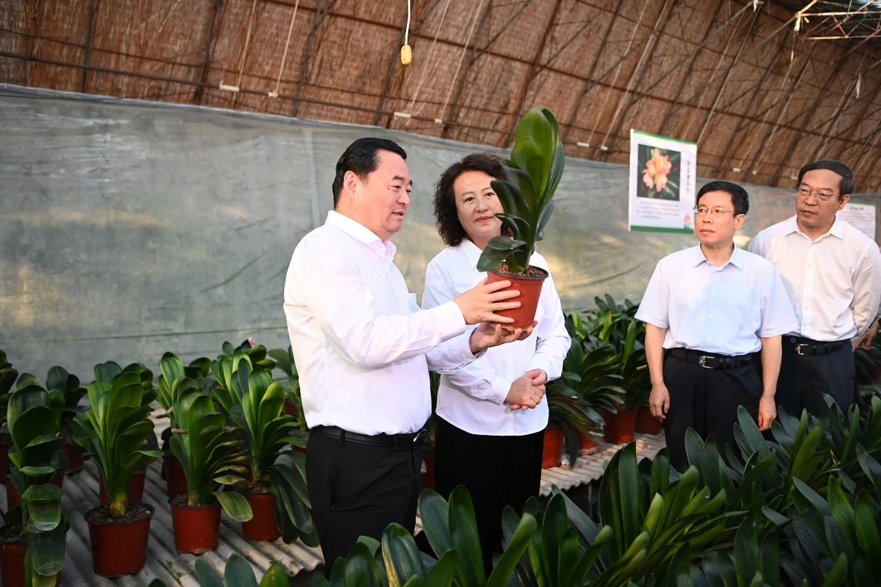 省委书记、省人大常委会主任郝鹏在盘锦市馨毓农业种养殖专业合作社听取君子兰新品种研发和农产品销售情况。
