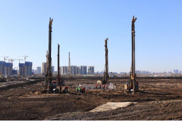 当日,在施工现场,机身扎上红飘带的桩基设备正在开钻,正在打下第一根桩,2026年10月30日前竣工移交。