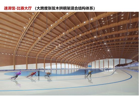 速滑馆设计积极响应国家可持续建筑发展战略,采用大跨度张弦木拱钢架混合结构体系,是当前国内首创的结构体系;同时通过建筑被动式技术、主动式高性能能源系统及可再生能源系统应用,结合天然采光、自然通风、围护结构保温隔热等气候适应性技术措施,以及设备能效提升、低碳运营策略等途径,实现超低能耗建筑目标,打造了“全国单体面积最大的超低能耗体育建筑”“东北地区首个超低能耗体育建筑”。