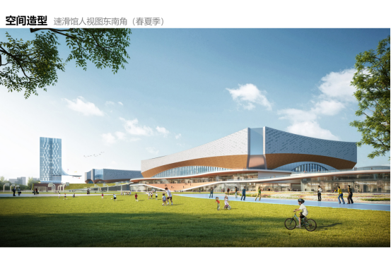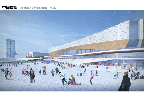 王家湾冰上运动中心作为甲级体育建筑可举办全国性和单项国际比赛,建成后将成为全国乃至国际一流的冰上运动综合体;设计上将冰雪运动的精神与城市文化深度融合,打造一个集速度滑冰、花样滑冰等多功能冰上运动于一体的场馆群。