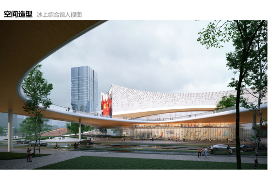 ★冰上综合馆:建筑面积约8.88万平方米,高约40米,主体单层建筑,造型以长方体为母形、长弧线切割。设计上延续了整体简洁且富有雕塑感的立面处理手法。在面向城市重要景观带的角落局部打开,强化了中央绿带与建筑之间相互渗透,在让城市绿轴进一步延伸的同时也打破了轴对称观念对于传统体育建筑在造型上的束缚,结合四角轻微上拱的曲线,使得建筑整体在庄严中又增添了一份灵动。使用新型材料来营造雕塑感的同时,在各主要入口处使用木质立面,让市民即使在寒冷的冬季也能感受到体育建筑给人们带来的温暖向上的精神。大面积的光电玻璃的设计丰富了夜间中央绿带的城市形象。