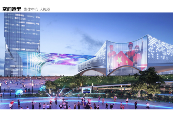 媒体中心雨篷天幕,使用LED装配,屏幕面积达1800平方米以上,市民可在广场和大平台同步观看赛场信息。