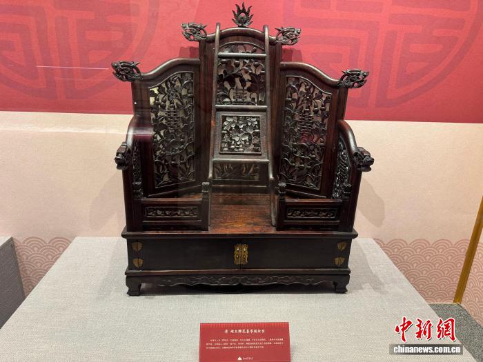 2月12日,“丹宸国色——沈阳故宫博物院建院百年新春特展”在沈阳故宫开展。图为展览中展出的清硬木雕花喜字梳妆台。