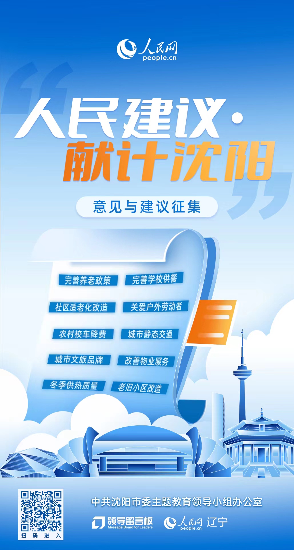 为更好地问计于民、问需于民、问效于民,中共沈阳市委主题教育领导办公室联合人民网“领导留言板”即日起开展“人民建议·献计沈阳”意见建议征集工作。