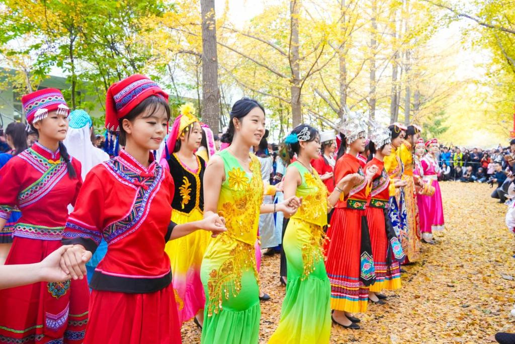 多民族学生与游客一起载歌载舞。