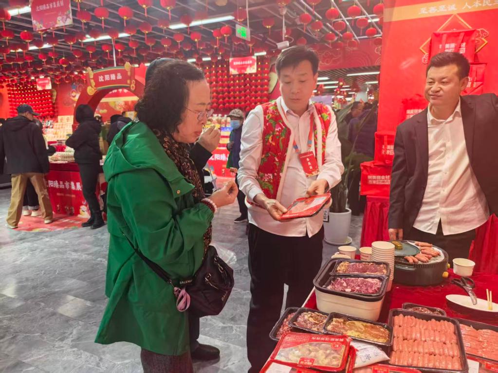 沈阳大东副食品商场,工作人员向消费者介绍特色食品。新华社记者刘艺淳 摄