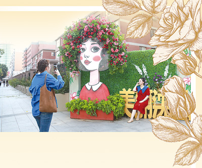 | 沈阳市民在位于青年大街上的玫瑰少女景观小品前拍照。 本报记者 胡婧怡摄 |