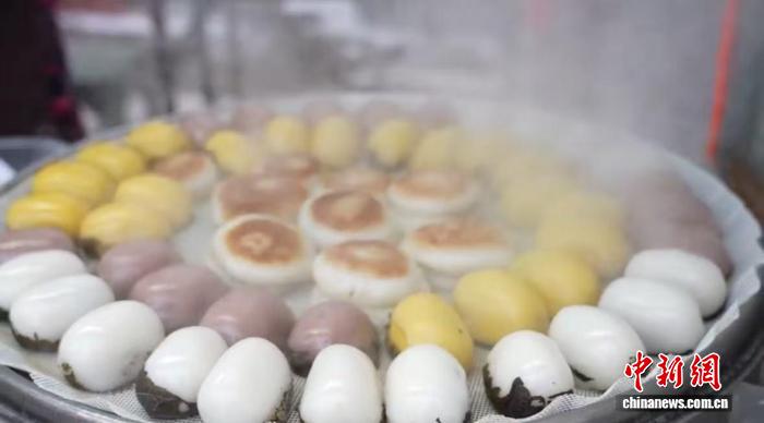 12月13日,沈阳小河沿早市,热气腾腾的各色粘豆包整齐摆放。李雪飞摄