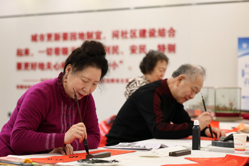 长安社区居民进行书法创作。新华社记者 李钢 摄