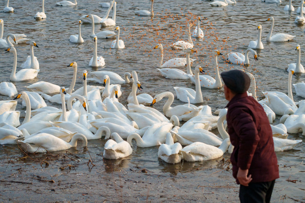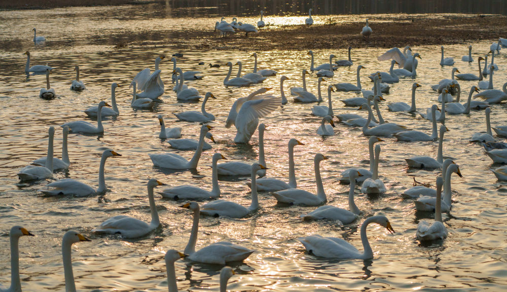 冬季以来,大批天鹅飞临辽宁省朝阳市大凌河栖息越冬,吸引人们前来观赏和拍照。