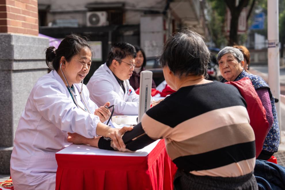 3月5日,在长沙市望城区高塘岭街道雷锋路社区雷锋驿站,志愿者(左一)为市民测量血压。新华社记者 陈思汗 摄
