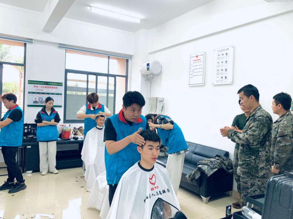学雷锋纪念日前夕,在海南省海口市某武警支队营区,2022年度全国学雷锋志愿服务“四个100”最美志愿者孙凯带着北京“梵珀匠人志愿服务队”和海南省技师学院的师生来到这里,为武警战士义务理发。“他们守护海疆安全,我们就用剪刀和推子为他们做好服务。”孙凯说。