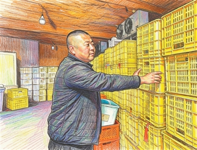 | 吉洪洲在整理自家冷库里的货箱。 以上图片均为本报记者刘佳华摄,AI修饰生成素描画 |