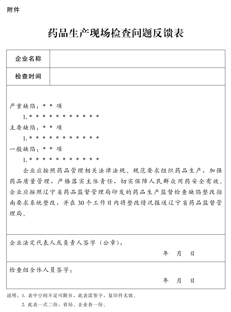 检查组以《药品生产现场检查问题反馈表》(附件)形式向被检查企业反馈缺陷项目。《药品生产现场检查问题反馈表》需经检查组人员和当事人签字确认,由双方各执一份。