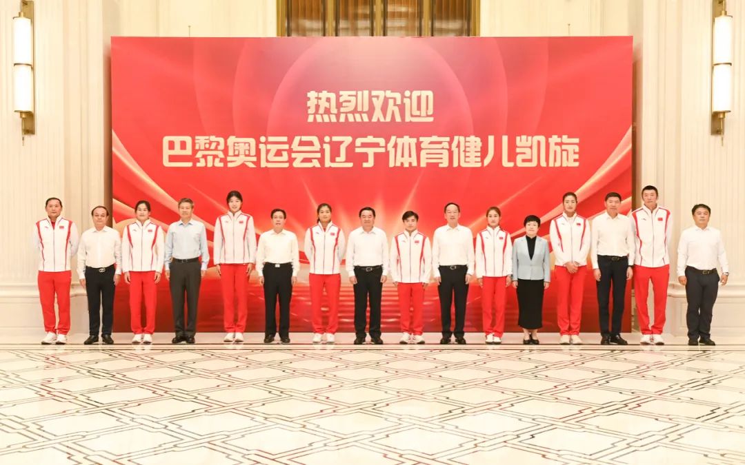 辽宁友谊宾馆气氛欢快喜庆,“热烈欢迎巴黎奥运会辽宁体育健儿凯旋”的标语鲜艳醒目。刘洋、谷丙凤、陈阳、余思涵等奥运健儿及教练员身着奥运赛服,步履矫健、精神抖擞,踏上红毯步入友谊宫。郝鹏、李乐成等省领导与大家亲切握手并合影留念。