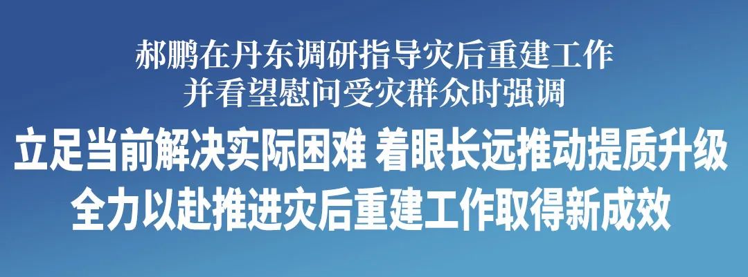 在丹东市,郝鹏现场办公,听取丹东市和省直相关部门灾后重建工作情况汇报,对需要解决的问题逐项分析,研究解决办法和支持政策。他强调,习近平总书记对防汛抗洪救灾工作高度重视,多次作出重要指示批示。当前,丹东市灾后重建工作取得了明显成效,要在前期良好基础上再接再厉,工作再加劲、措施再加力、进度再加快,集中精力把灾后重建各项工作抓实抓细。要加紧受损房屋修复重建,保证工程质量,确保按时完工,住房舒适美观。要做好基础设施抢修,加快修复受损的道路、水利以及重要基础设施,着眼长远加大基础设施改造升级力度。要保障农业稳产保产,提高理赔效率,最大程度减少农业因灾损失,坚决防止因灾返贫致贫。要抓好群众基本生活保障,加快受损换热站修复工作,持续做好环境消杀和防疫工作,确保群众安全生活、温暖过冬。要强化资金统筹,严守纪律规矩,确保灾后重建工程成为阳光工程、廉洁工程、安全工程、民心工程。