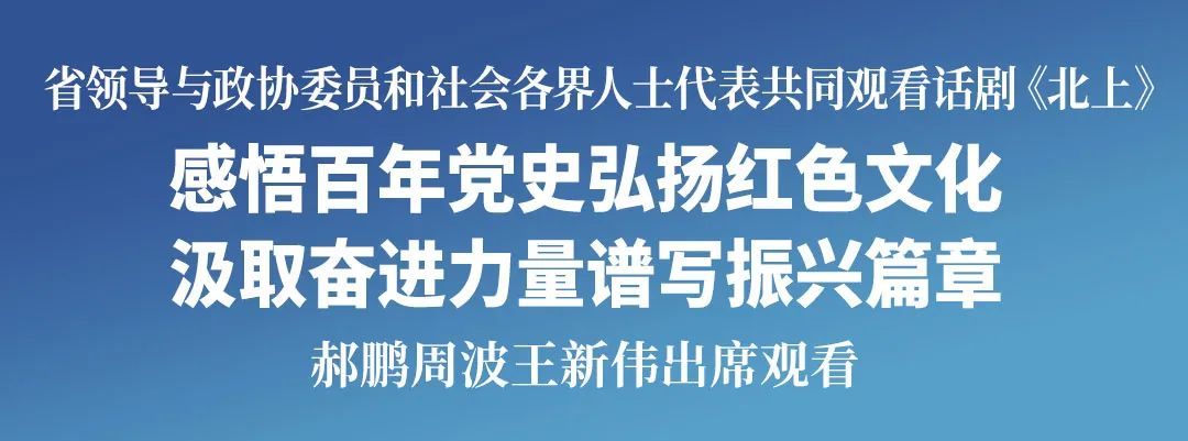 为深入学习贯彻习近平总书记在庆祝中国人民政治协商会议成立75周年大会上的重要讲话精神,庆祝中华人民共和国成立75周年、中国人民政治协商会议成立75周年,9月20日晚,省领导与政协委员和社会各界人士代表在辽宁大剧院共同观看革命历史题材话剧《北上》,在百年党史中深刻认识统一战线重要法宝作用,聚焦打造新时代“六地”目标定位,紧紧围绕实施全面振兴新突破三年行动,聚力开展“八大攻坚”,进一步凝聚人心、汇聚力量,共同谱写中国式现代化辽宁篇章。省委书记、省人大常委会主任郝鹏,省政协主席周波,省委副书记、沈阳市委书记王新伟出席观看。